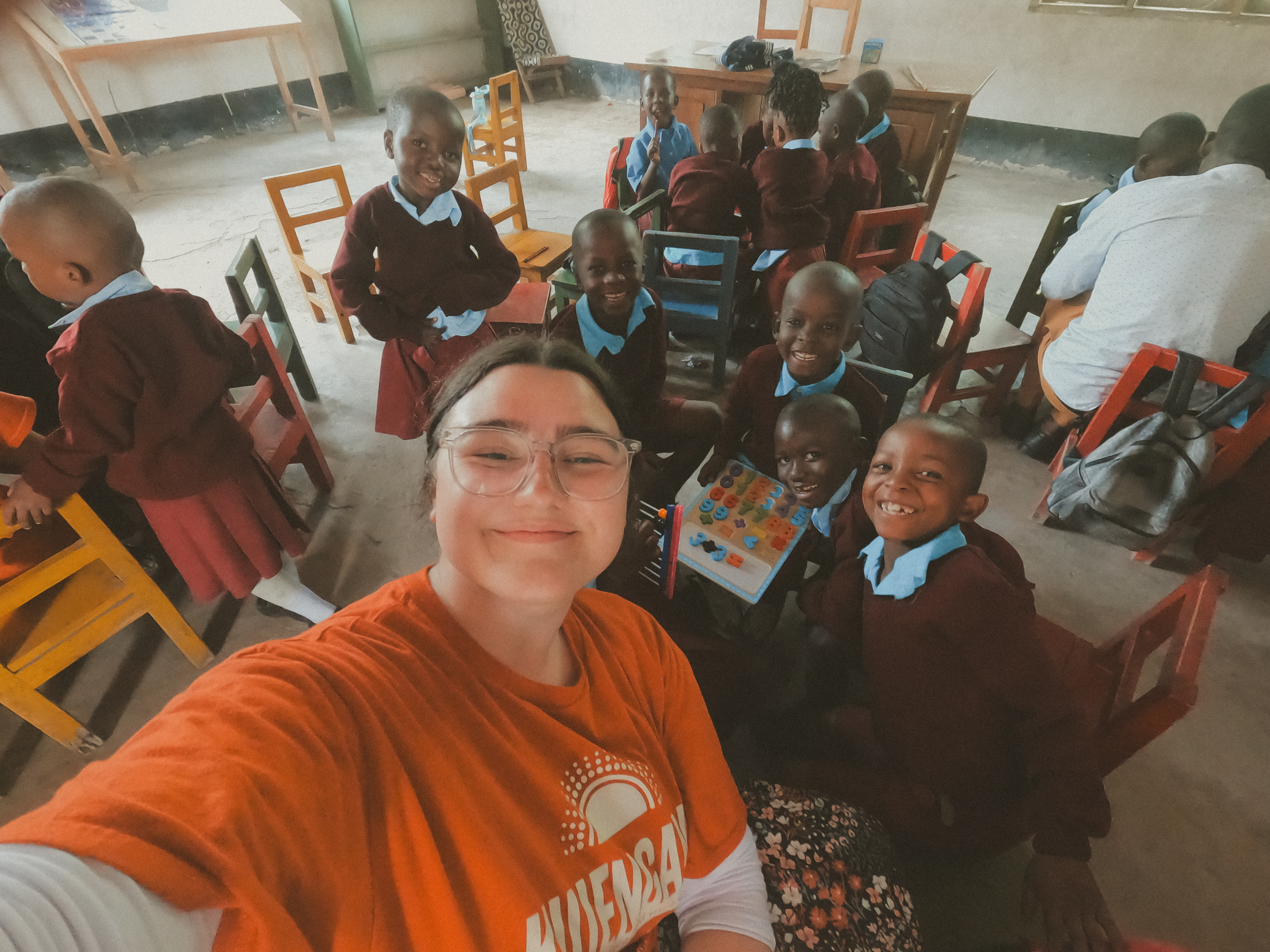 After the kids went for breakfast, Sarah and I moved to the baby class and class 1. At first, it was a little overwhelming—the kids surrounded us, each bringing their chairs right up to us—but Baraka stepped in and helped get everyone situated. I worked on math with the class 1 students, counting on our fingers and adding objects. Their excitement when they understood something was priceless.
